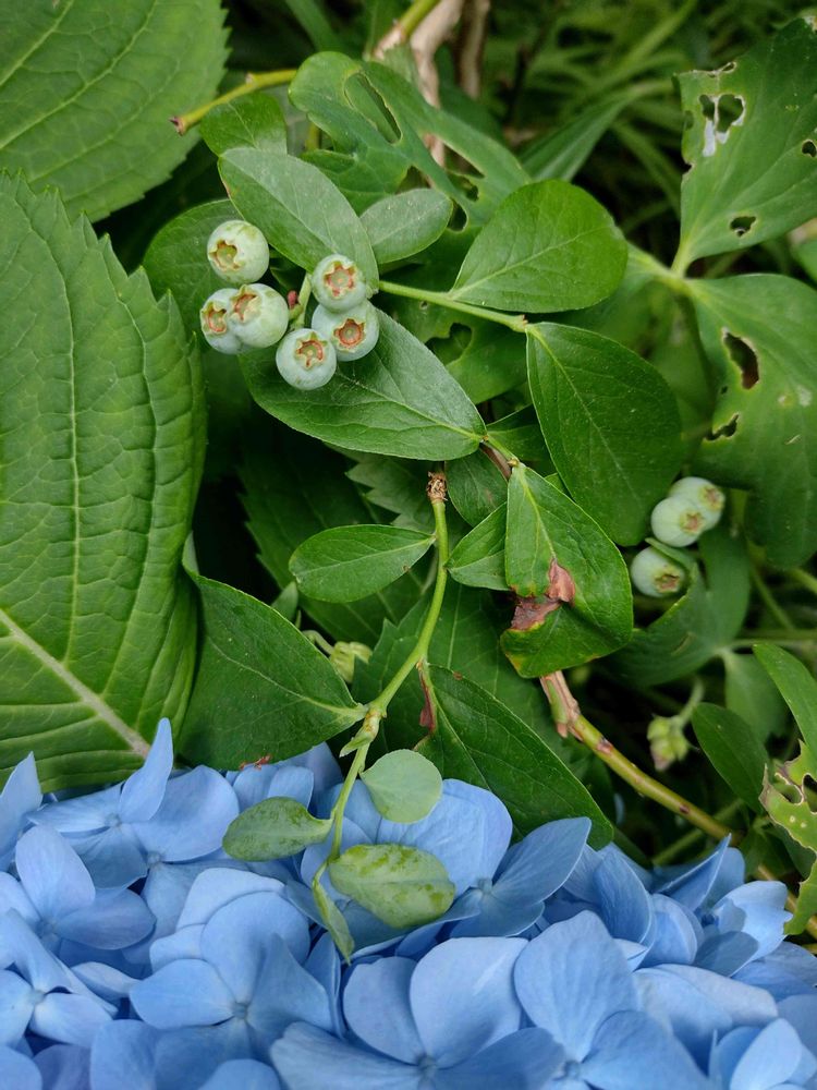 ブルーベリーの花は咲いたけど、実はどうなっているかな(?)と思ってよく見たら、少しだけど実が付いていました。無事食べられるところまでいきますように😊。