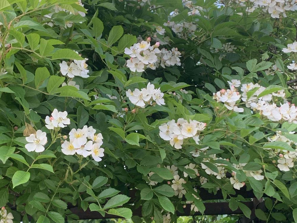 バラのアーチは、モッコウバラが終わり、ミニバラ🤍が、満開💕