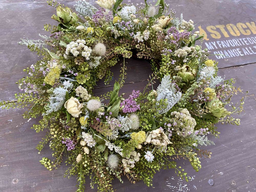 野の花リース、豪華な花使わなくても可愛いかなと最近の傾向😅