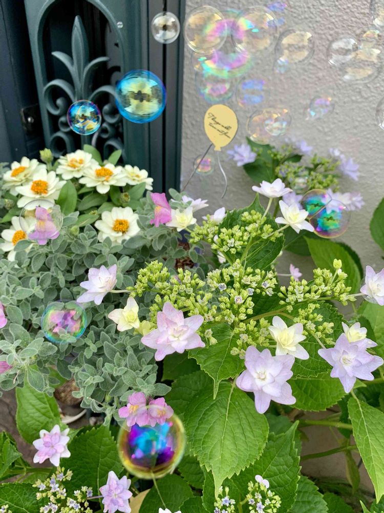 シャボン玉の色が無色透明の時もあれば、紫やブルーのキレイな色に写る時もあります!コラボすると、お花も可愛さアップ☺️