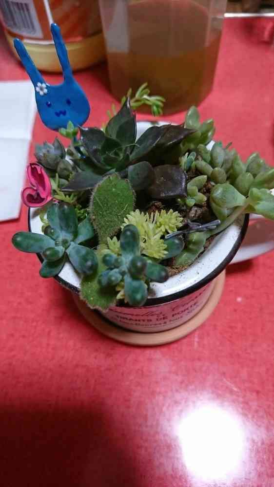 かわいい多肉さんを赤いウサギが成長を見守ってますね。
