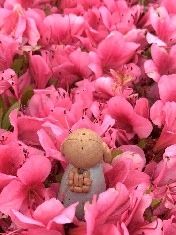 今日も感謝の1日にありがとうございます🙏お花の中でお地蔵さんが温かいほほえみ😊ありがとう、ありがとうって思います🙏