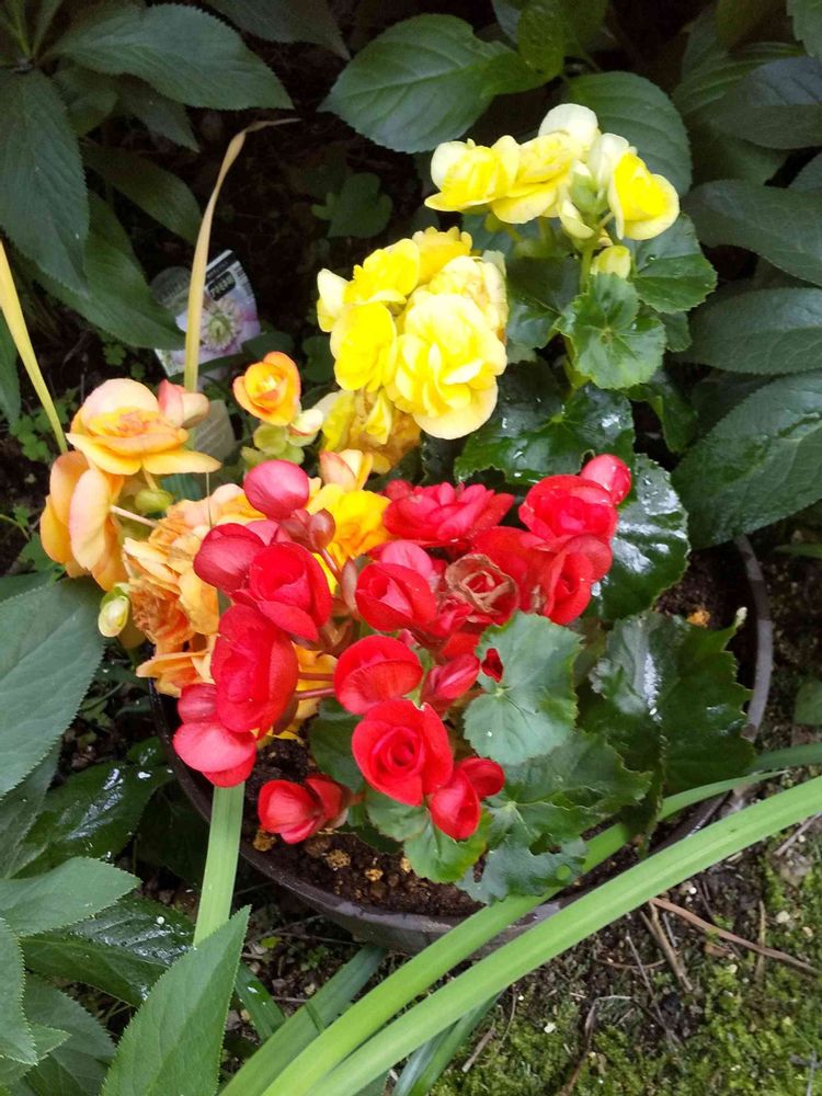 3色のエラチオールベゴニアを寄せ植えにしました。