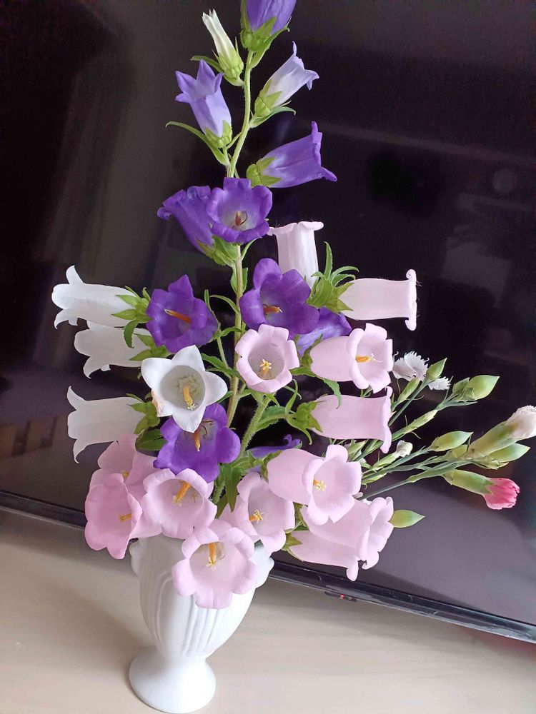 雨が続くので、庭のカンパニュラを活けてあります。♪