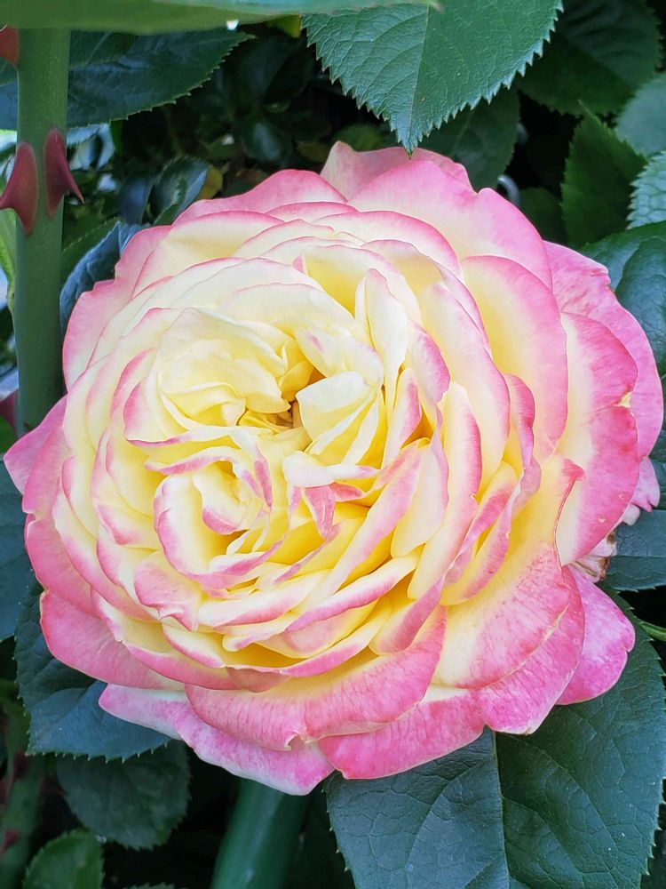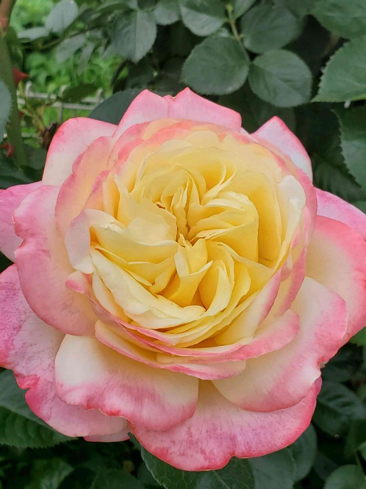 大輪で、咲き進むと、黄色からピンク、赤へ変化します。