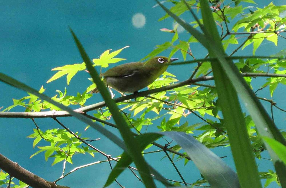 エメラルドグリーンの池をバックに鮮やかな新緑と緑の小鳥🍀✨💚