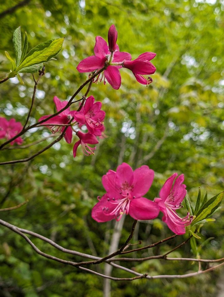 岐阜県の雪国、天生湿原の花⑱ 新緑のブナ林にパッと赤いかんざしの花、優しい小枝に若葉と花が同時に咲くヤシオツツジではちょっと変わり者。2…24.5.30 登山道