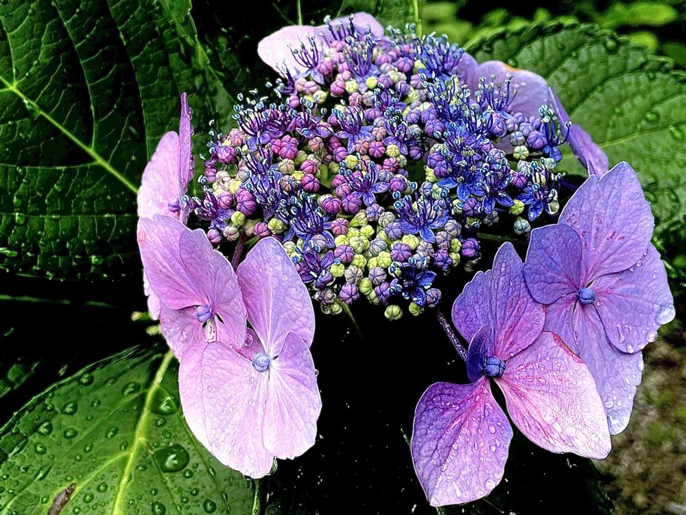 雨粒でしっとりした紫陽花、色合いもいいですね。