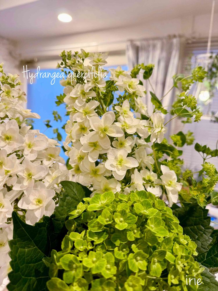 庭に咲いたカシワバアジサイとお花屋さんで買った緑色のアジサイ🐸✨爽やか〜💚🤍🩵