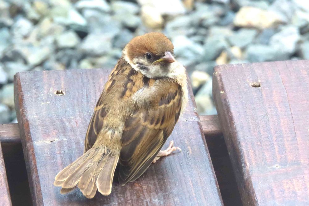 全く警戒しない雀の幼鳥