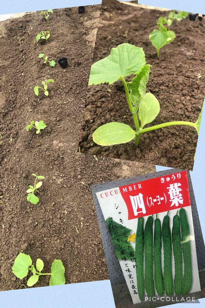 四葉きゅうり✨️畑に植え付けです‼️ちょっと徒長気味だけど、気にしないヽ(○︎´3`)ノこれからの成長を見守るのみです☺️