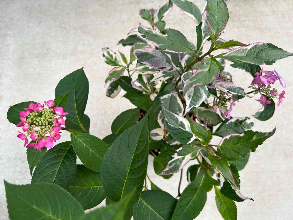 そうなんですよね〜。斑入りの葉っぱがついてる枝とそうでない枝があって不思議な感じしますよね〜🤭ヤマアジサイとハイドランジアの交配種なんですか。ちょっと納得です😅