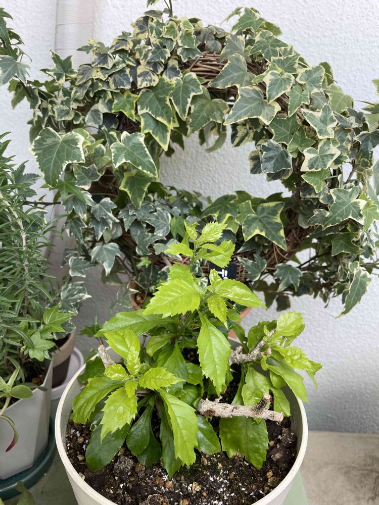 長く伸びたアイビー、前は支柱を立ててタワーにしてたんですけど、風で倒れたので低くしようと思ったのが始まりです。