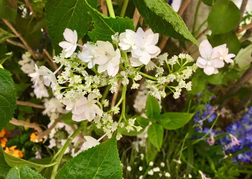 そごう横浜店の入り口側にあった植え込み、他の花はお疲れ気味でしたが、真っ白なヤマアジサイ?は、ひときわ元気に咲いていました。ヤマアジサイでいいのでしょうか?どなたか教えてください🙇♀️