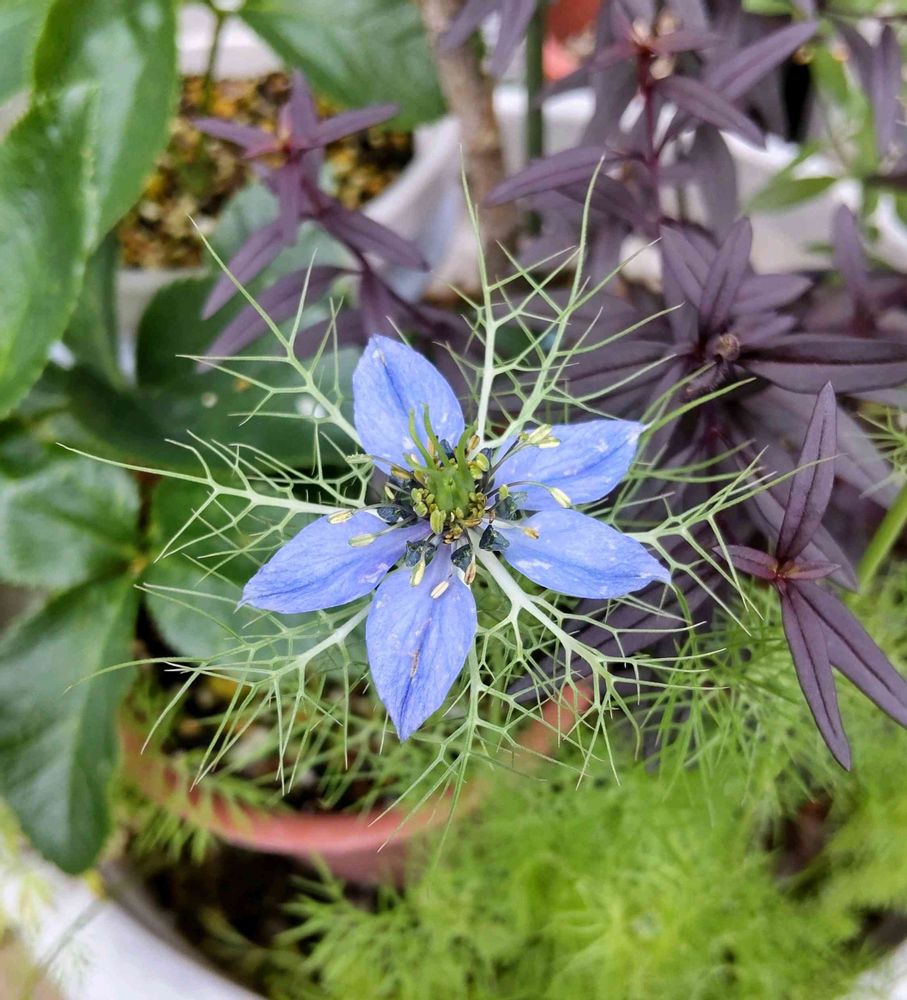 ニゲラの仕分けが追い付かず、結局こぼれダネから青の一重や白の八重が咲き乱れています