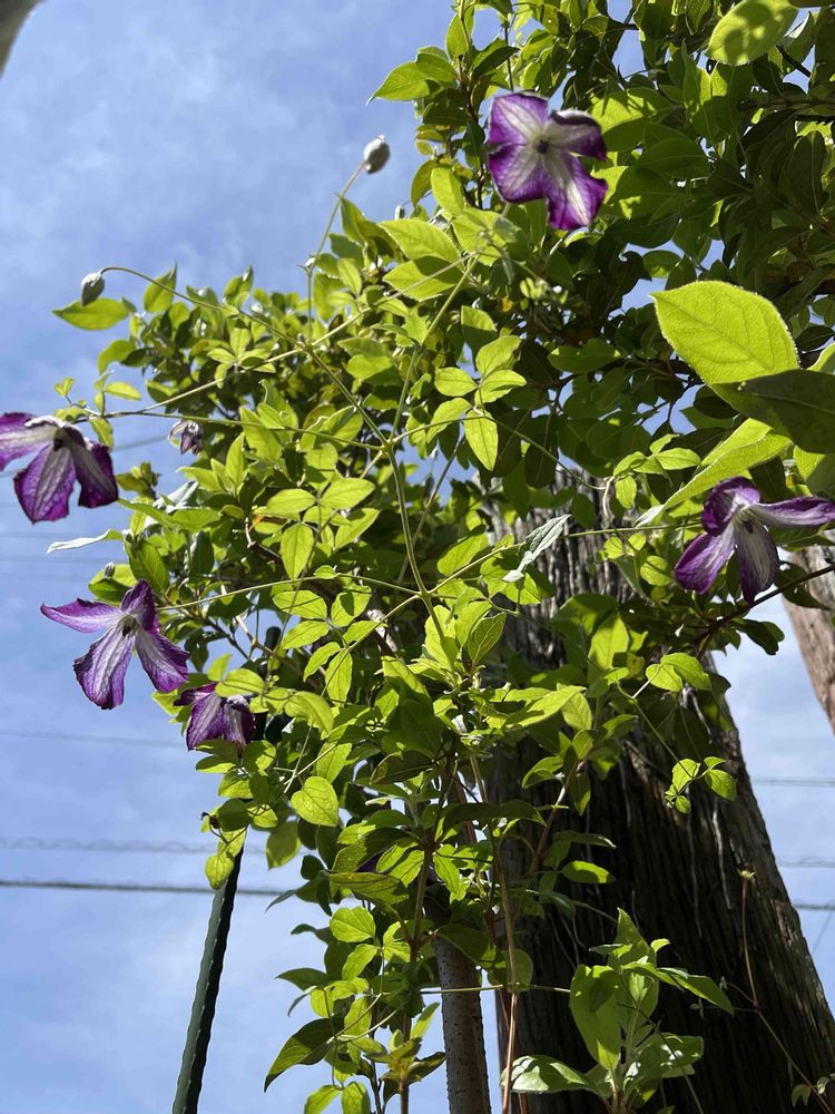うつむいて咲くのでのぞき込まないとお顔拝見出来ないけど 紫と白のグラデのとてもキレイなクレマチスです