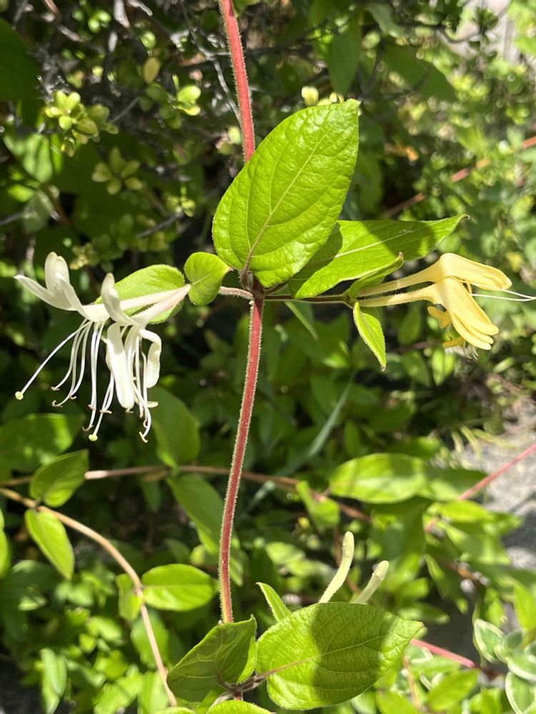 私的にはスイカズラの仲間で、ツキヌキニンドウ(突抜忍冬)という、赤いラッパみたいな花が名前も面白いし、好きです☝こちらにも有ります。