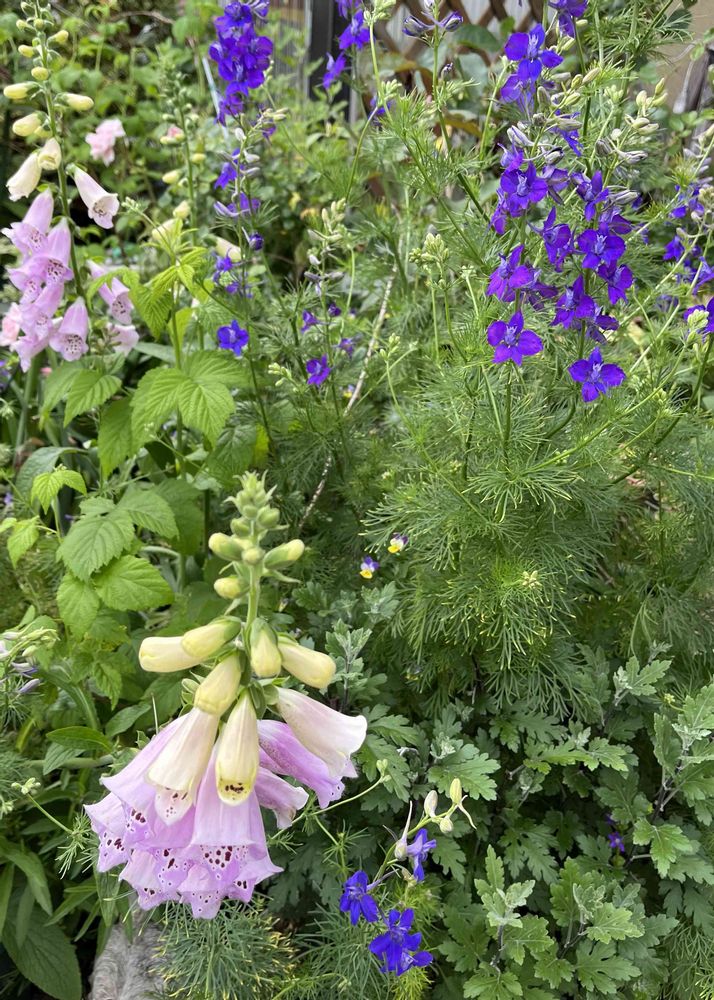 3 こぼれ種で伸び、鉢植えにしたジキタリスと、自然にお任せの千鳥草が最近とっても元気です。
