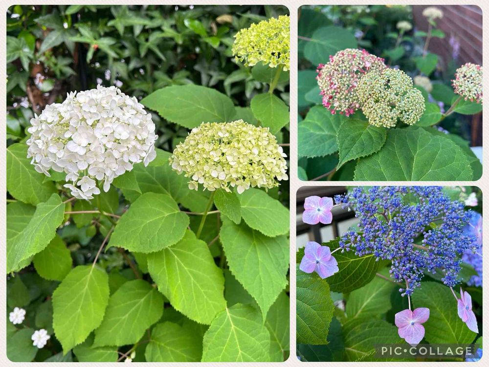 紫陽花いろいろ〜 ピンクのアナベル2 が咲き始めてきてワクワク✨白いアナベルの左下は八重咲きドクダミ🤍