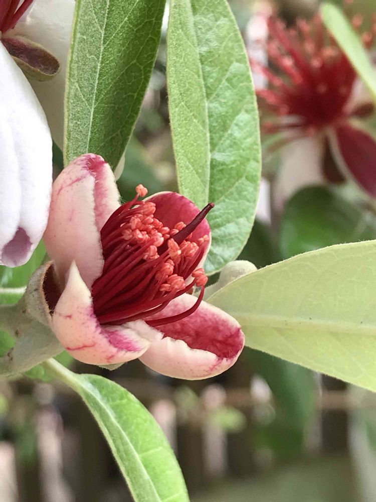 道沿いの植え込みのフェイジョア。花の時季になりました。