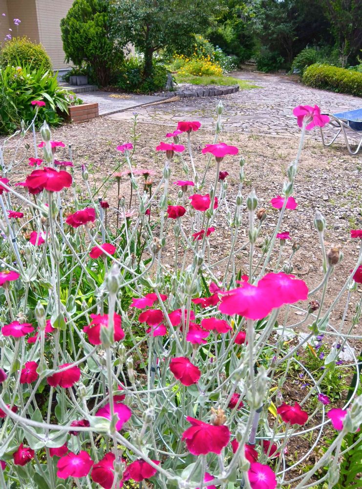玄関前の石畳の脇に作った花壇のフランネルソウの花が満開です😃🌸🌿