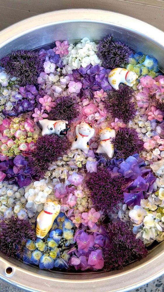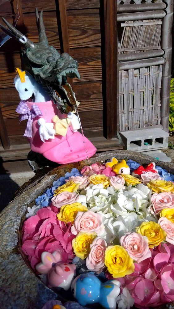 美しい花手水と可愛い人形の演出が素敵です✨