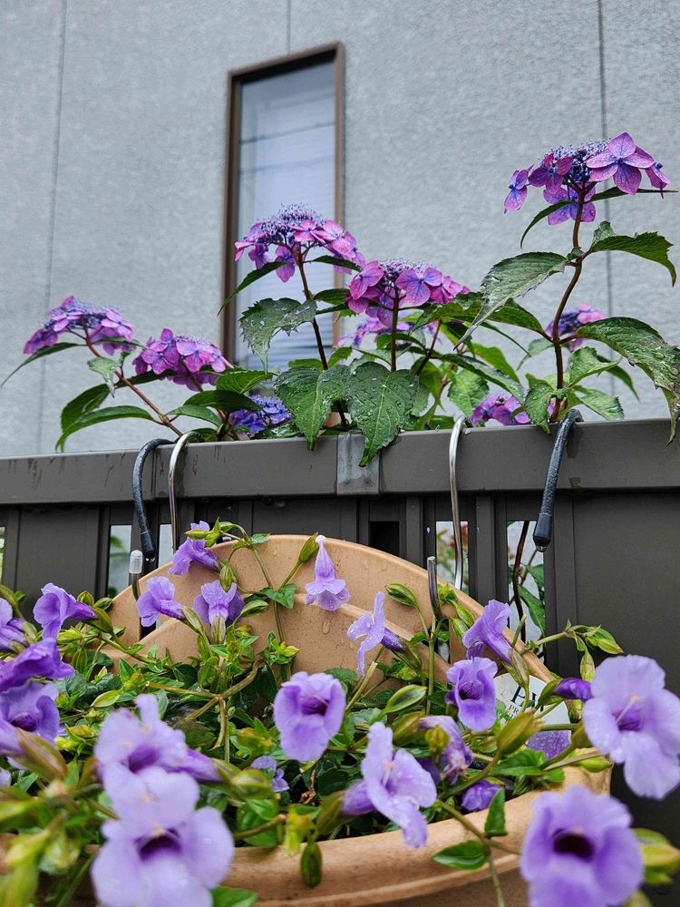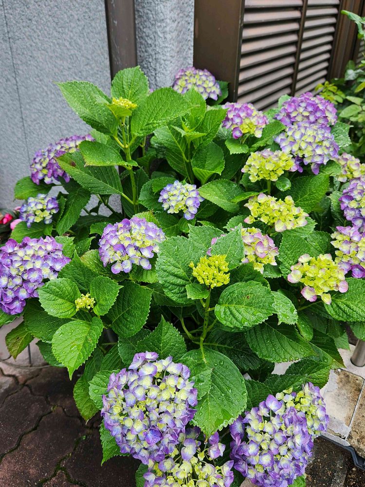 大鉢の紫陽花、紫ところどころ、青っぽい。この方に、6月、楽しませてもらいましょ