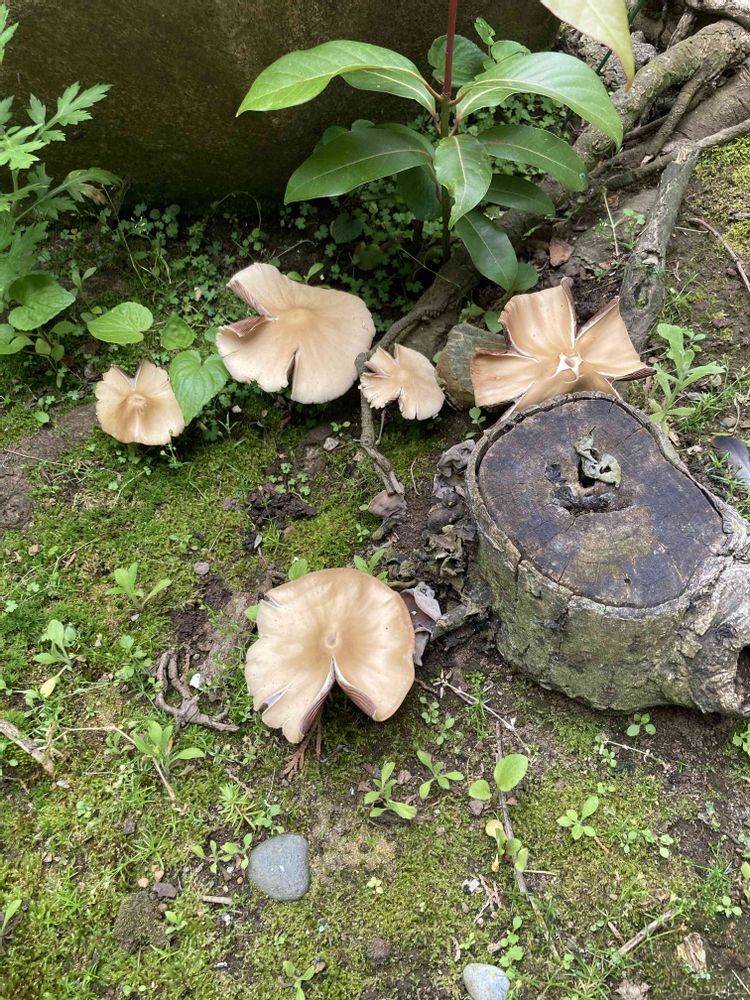 庭にキノコが生えてました。傘径10㌢位です。傘が薄く、乾燥すると裂ける、裏のヒダが紫褐色、柄が中空なのはイタチタケでしょうか?イタチタケは可食ですが、食べ過ぎは中枢神経系の中毒になるようです。