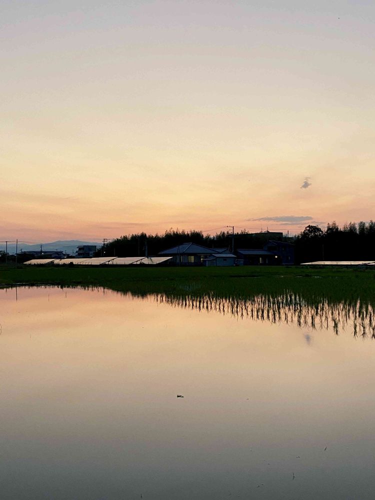 家の周囲の田んぼは、ほとんど田植え完了、夕方に散歩に行くと、夕景が水田に映り込んで、幻想的で美しいです。この風景、いつまでも続いてほしいものです。