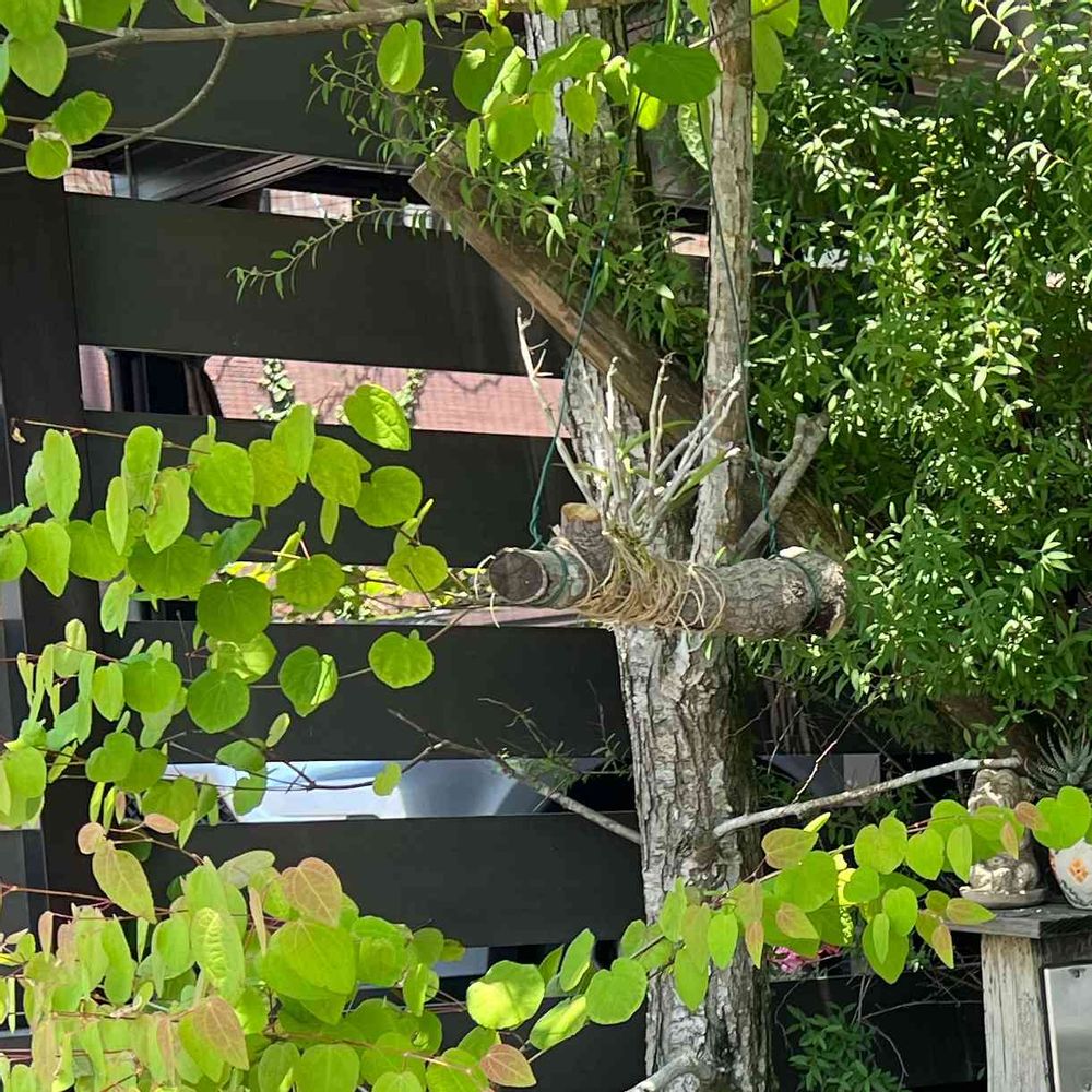 石斛を剪定枝に巻きつけて、かつらの木にぶら下げてみました。