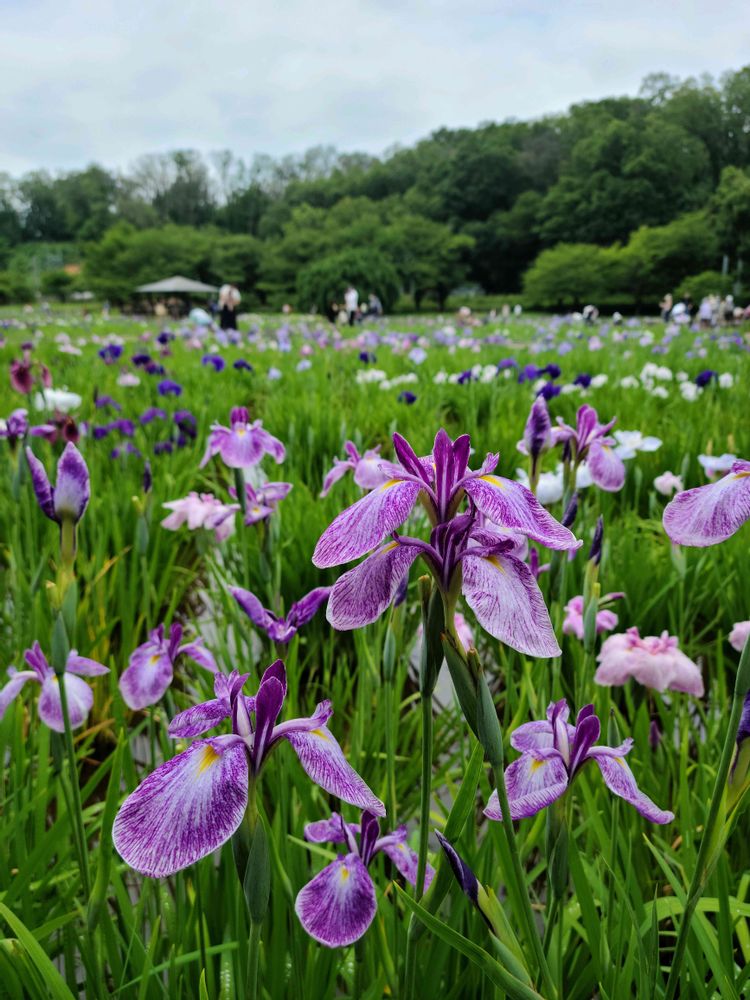 午前中は雨も降らず、八国山を背景に、緑の中に繰り広げられる色とりどりの菖蒲を堪能してきました🙌