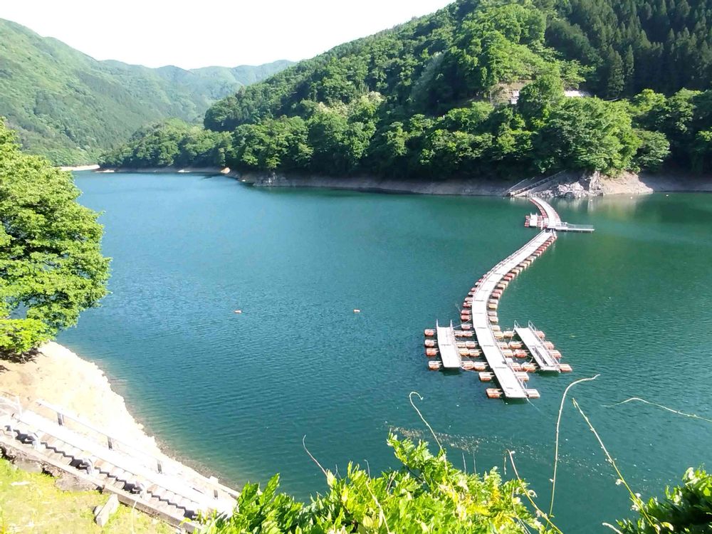 写真④:麦山の浮橋(ドラム缶橋)※渇水で危険な為一時的に渡れなくしています ※昔はホントのドラム缶が使われていました