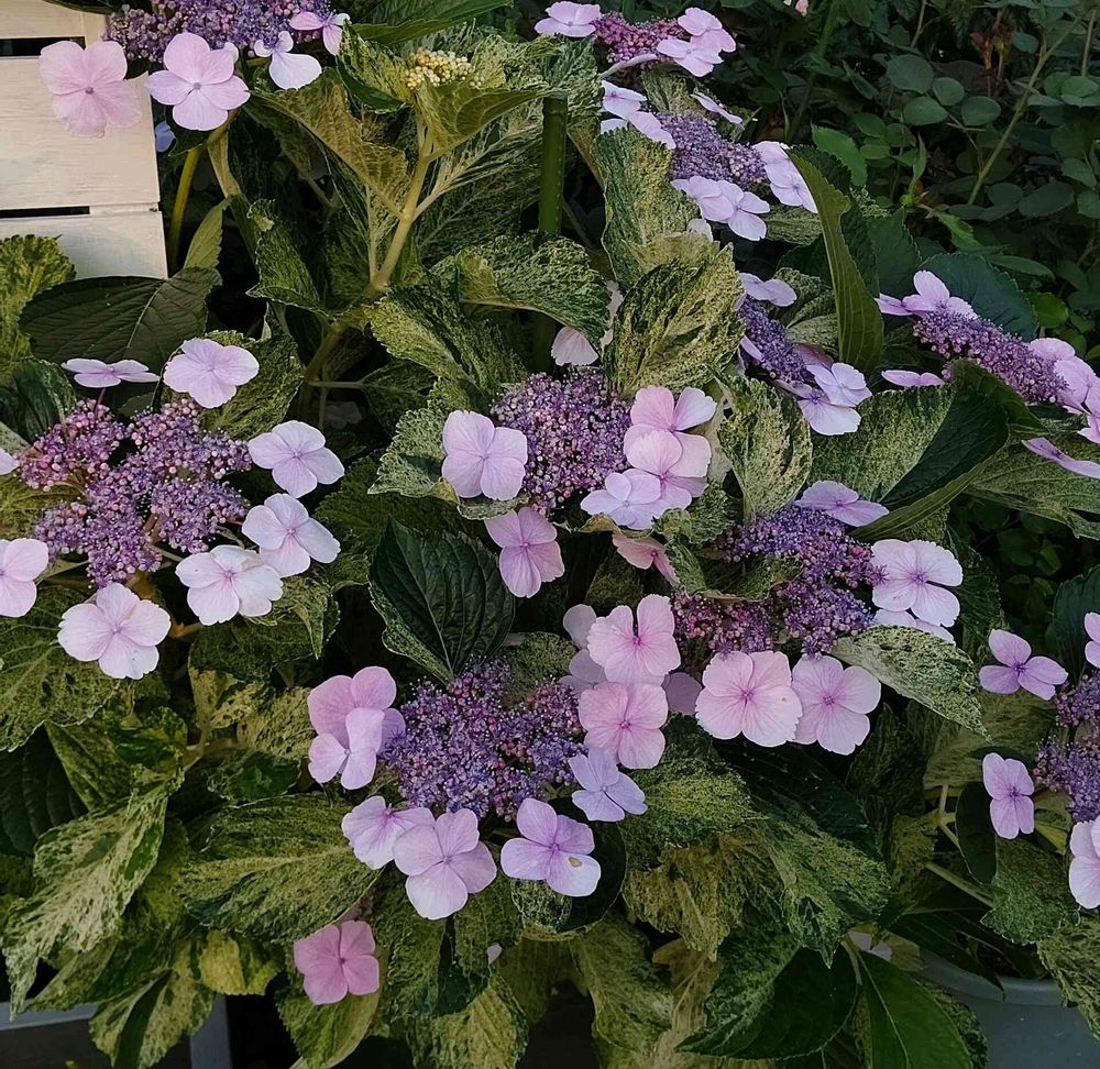 葉っぱが斑入りなので普通のガク紫陽花とは違った雰囲気で…とってもオシャレですね~🩷💚💜