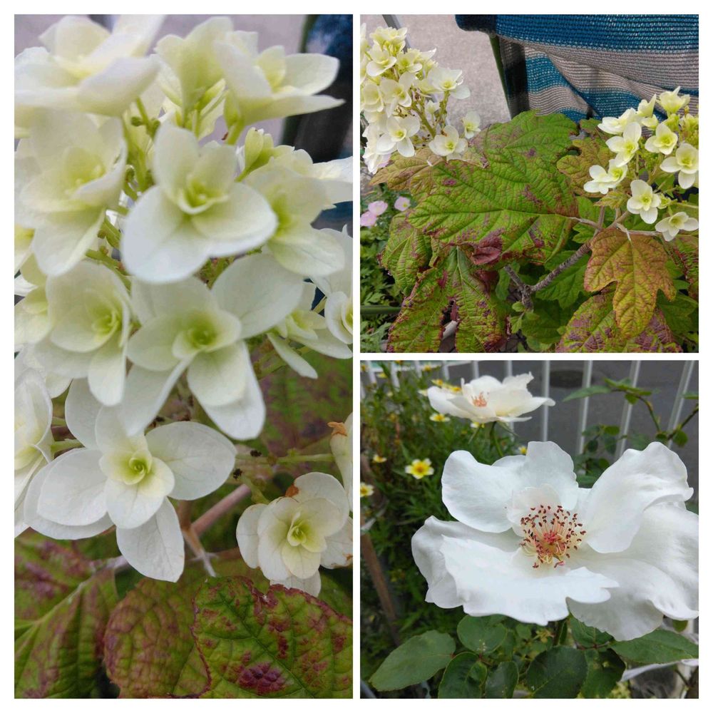 1枚目柏葉紫陽花と薔薇の花三輪目開花 じっくり考えたら実生から発芽させと云いながら、完全な熟した種を発芽させたのか? の疑問と