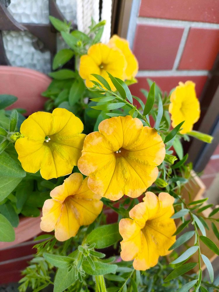 ペチュニアトロピカルティーさんです。💛色から、🧡色に変わります。変化するペチュニアさんは、楽しいで〜す。🤭