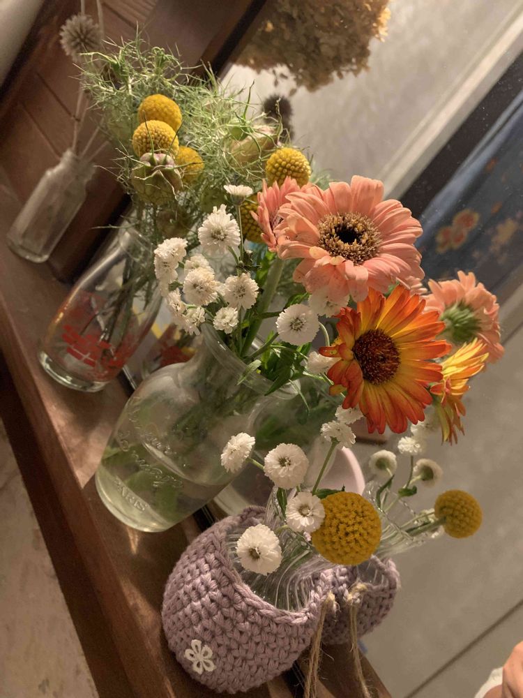 ガーベラやクラスペディアが雨で可哀想なので、昨日切ってきて洗面台に飾りました😊だいぶ賑やかです😄