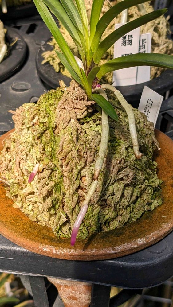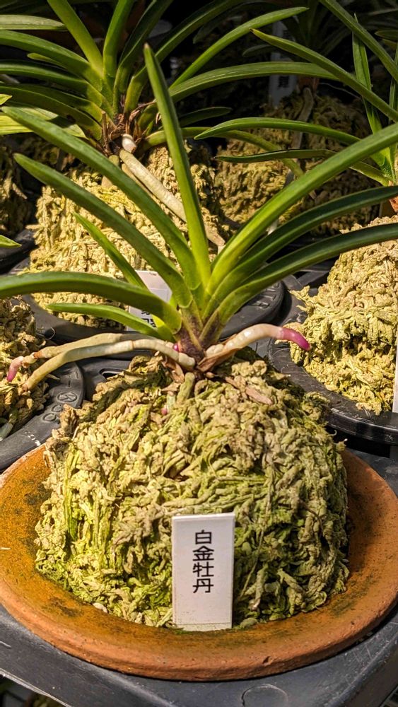 引き続き風蘭のルビー根です。白金牡丹という名で入手しました。この品種は気難しくて日陰管理をしています。