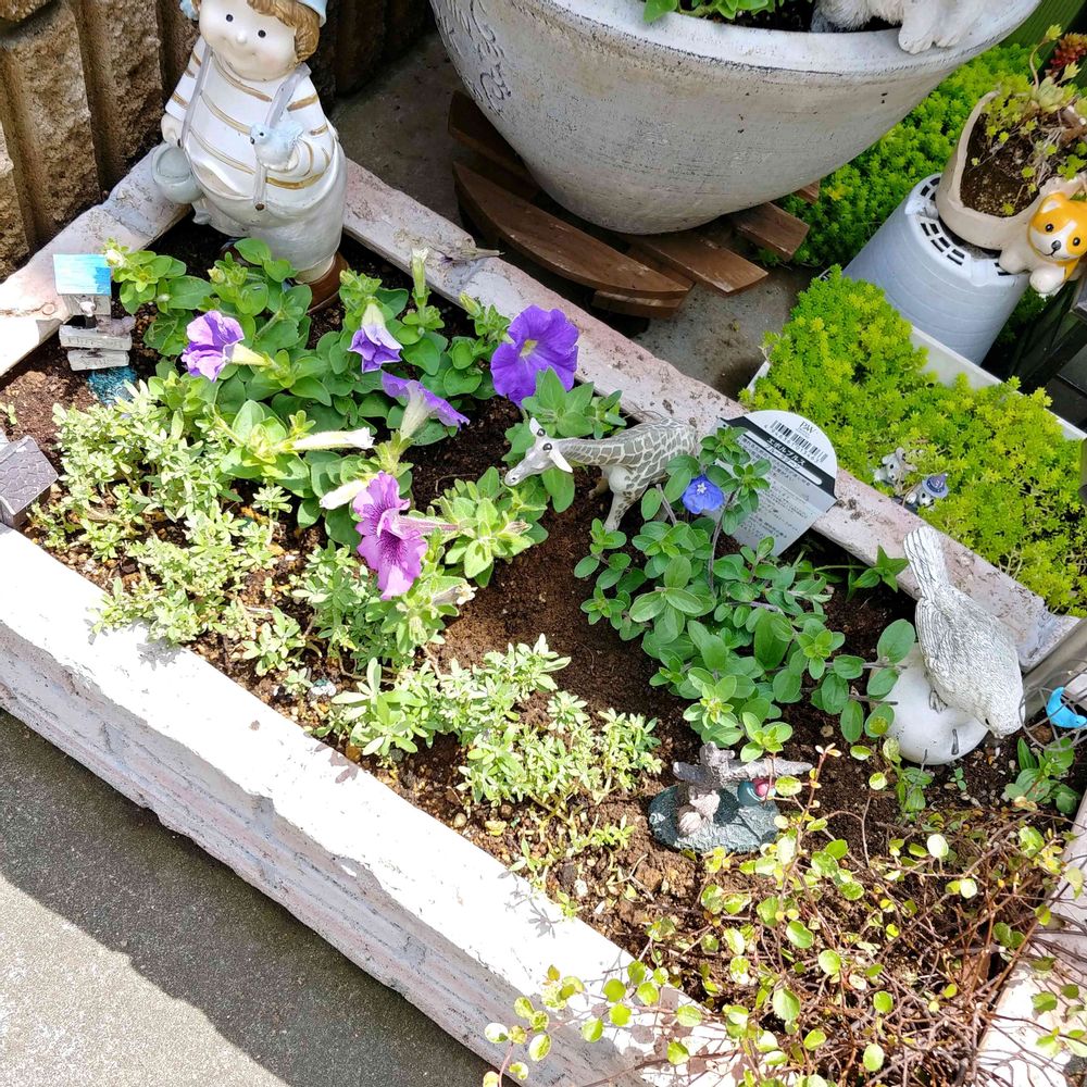 花壇の模様が入ったほうのペチュニアは、ここから盛り返すイメージが持てなくて、アメリカンブルーを足した。