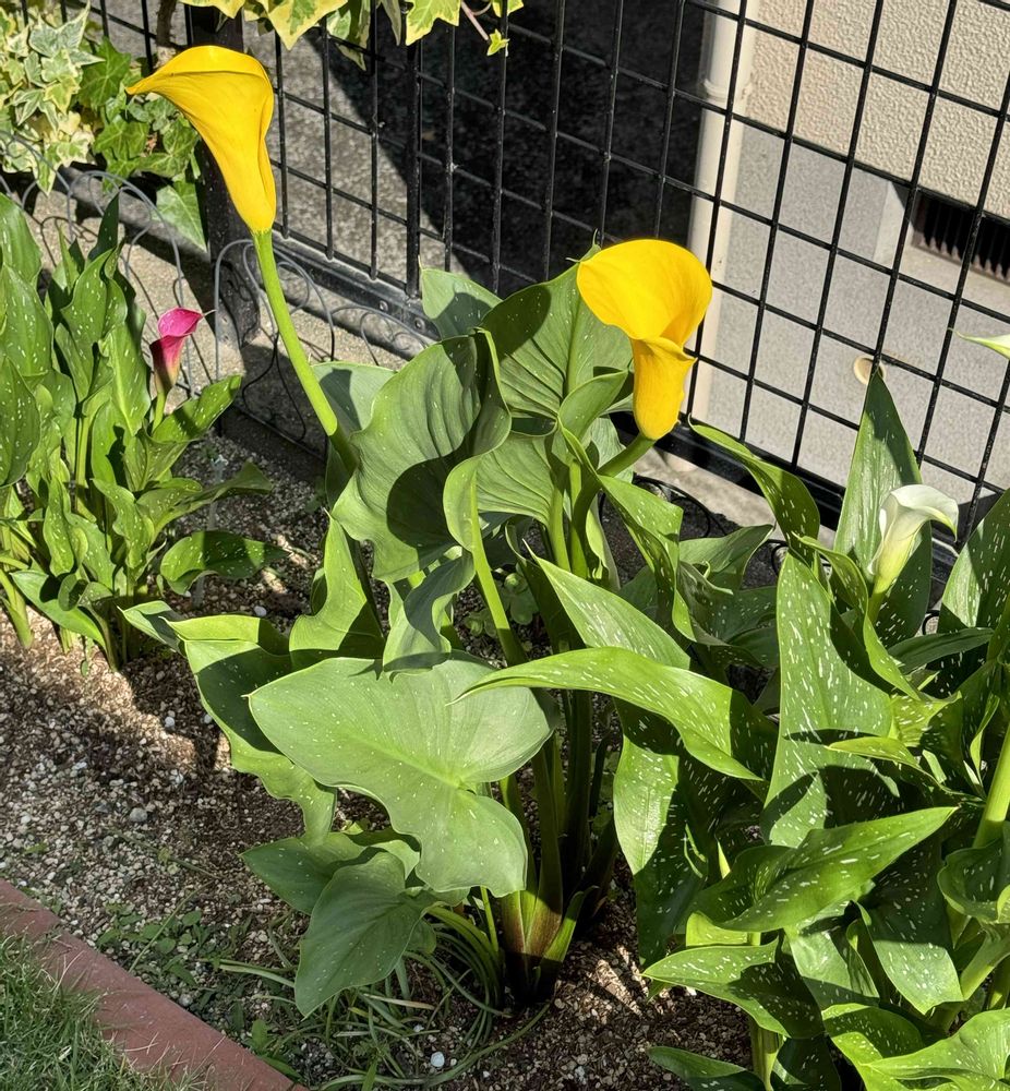 カラー、綺麗に咲いてますね😍うちの黄色は去年10年ぶりに花が咲いたけど、今年は、また葉だけか繁ってます。水と肥料が足りないのかな?ピンクは咲きますが、もう少し先のようです。