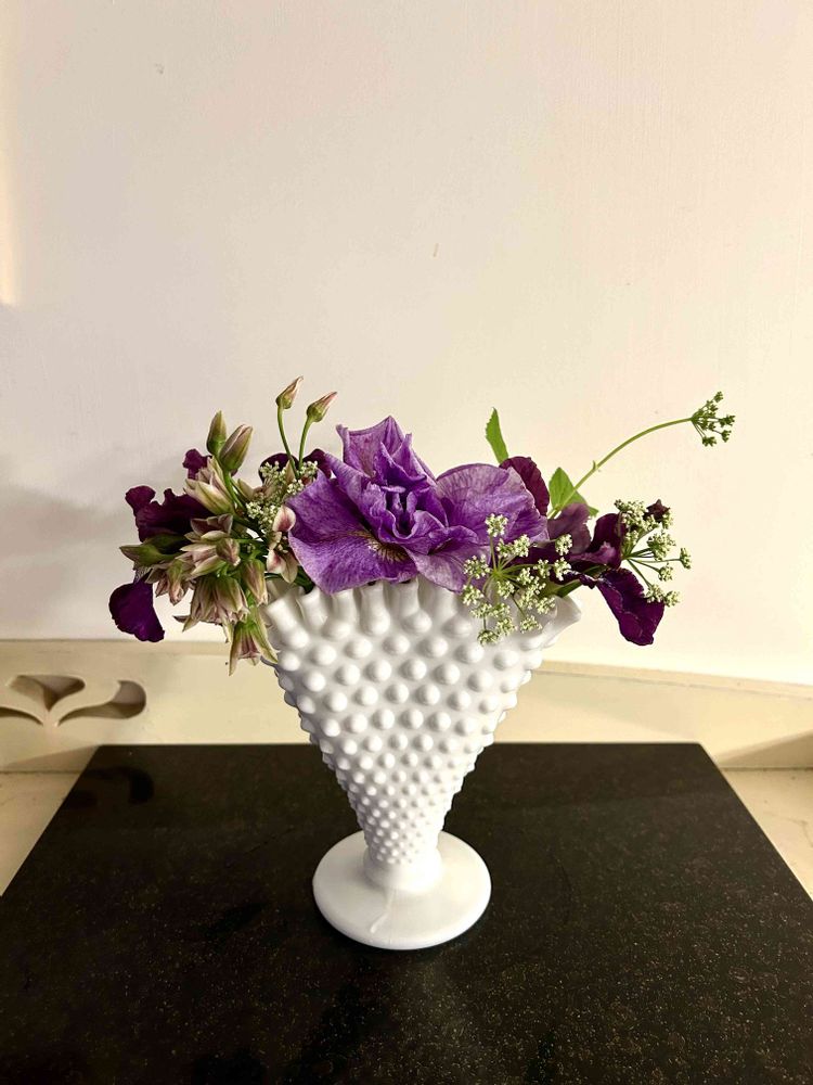 ミルクガラスの花器にフリルアイリスが映えて素敵です🩷