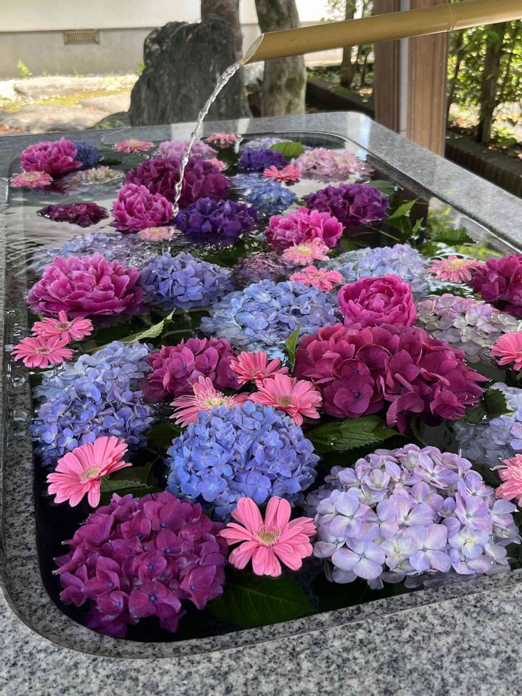 神社⛩️のお名前も綺麗ですがこの時期は花手水も紫陽花なんですね〜💜🩷💙
