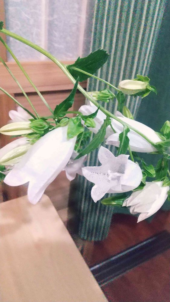 いつのまにか、白いホタルブクロが咲いていて、雨に打たれて横倒しに。