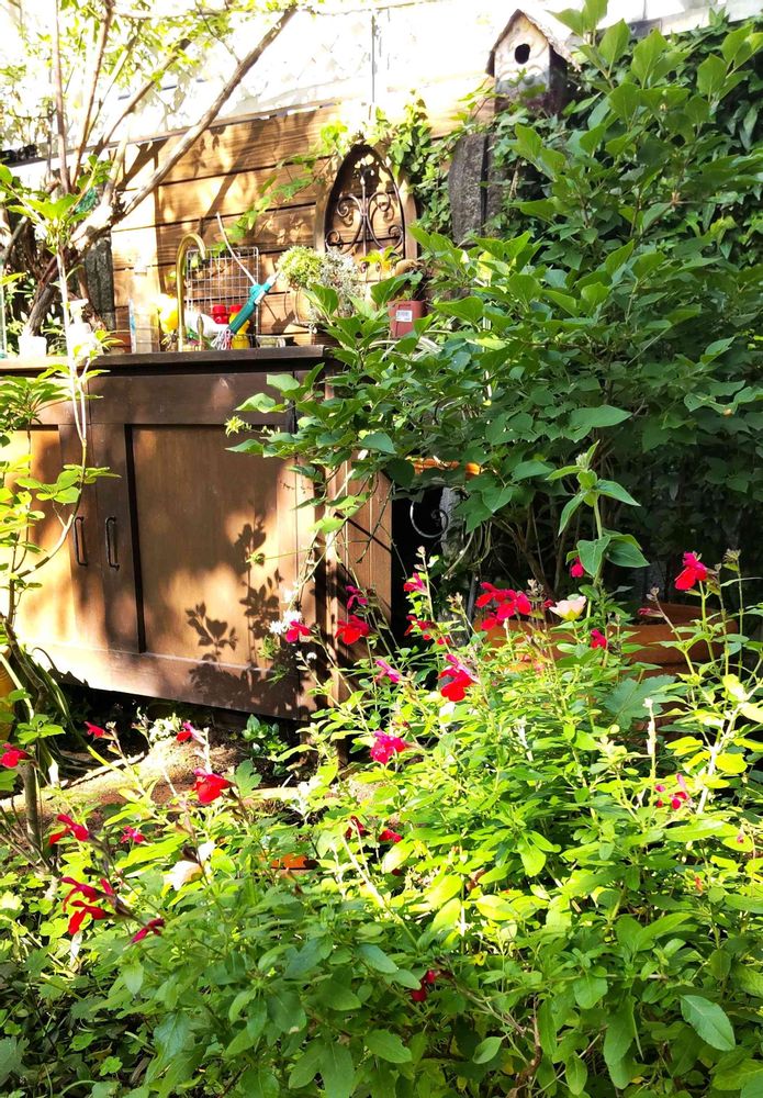 木が中心の庭です。 好きな所に好きな植物を植えています。 鳥さんがやって来て ... いろんな贈り物をくれました。私と鳥さんとの合作の庭です。 又、雑貨が好きで手作りが好きで、あちこちにぶら下がっています。