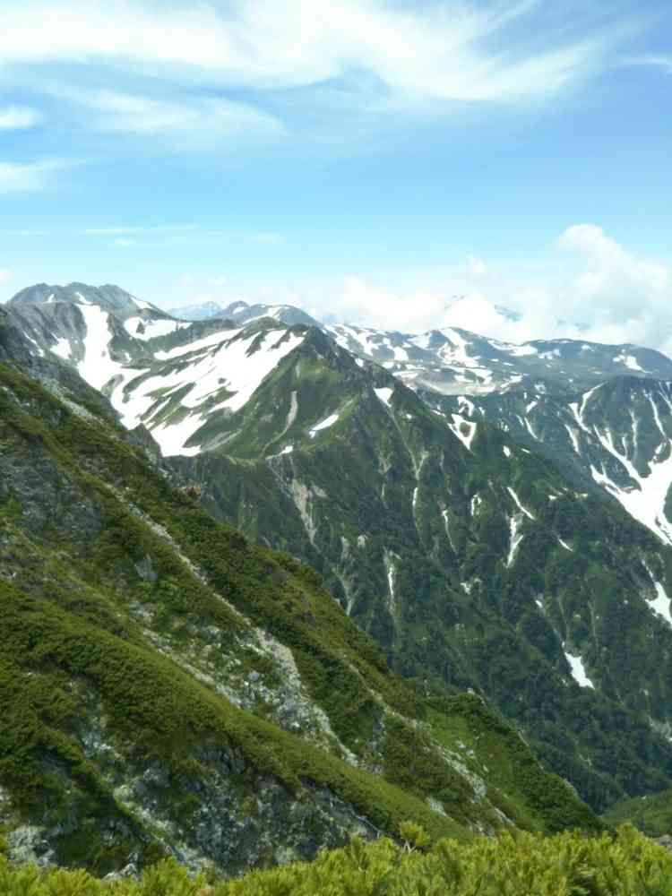 標高が高くなると、はえているのは、ハイマツだけになりました。早月尾根からの景色です。左手に見える高い山が、立山になります。