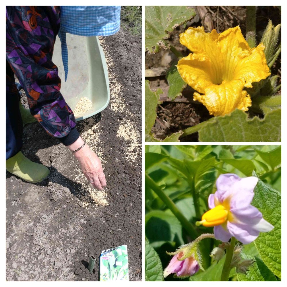 👵(種まく!) 突然いいだしたので 準備してあげました みわたすと 🍅🥒🎃ほうれん草まで 花咲かせていました