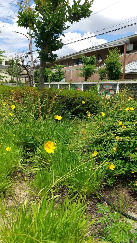 わかすぎ園の前に、黄色いオオキンケイギクとキンシバイの花が綺麗にたくさん咲いていました。