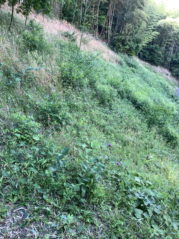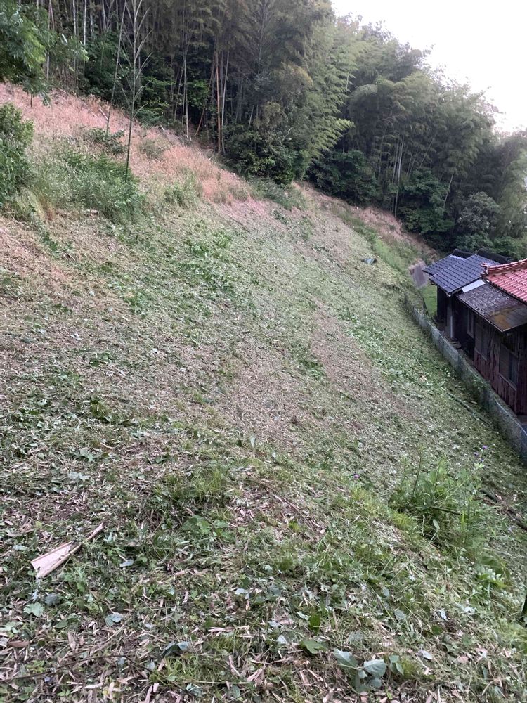 建物の後ろに窓ガラスあるので、刈り上げるような草刈り作業ですし、急斜面なので、今筋肉痛起こしてます😅広範囲と剪定で4時間かかりました⏳
