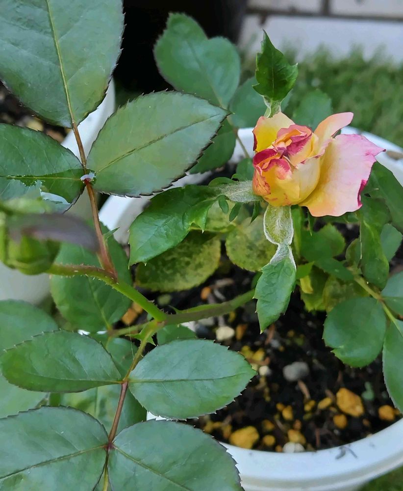 2年前に、瀕死状態だった我が家の薔薇の一枝を、挿し木名人のお隣さんに託したのですが、先日「もうすぐ咲きそうやよ」と言って持って来てくれました🌹