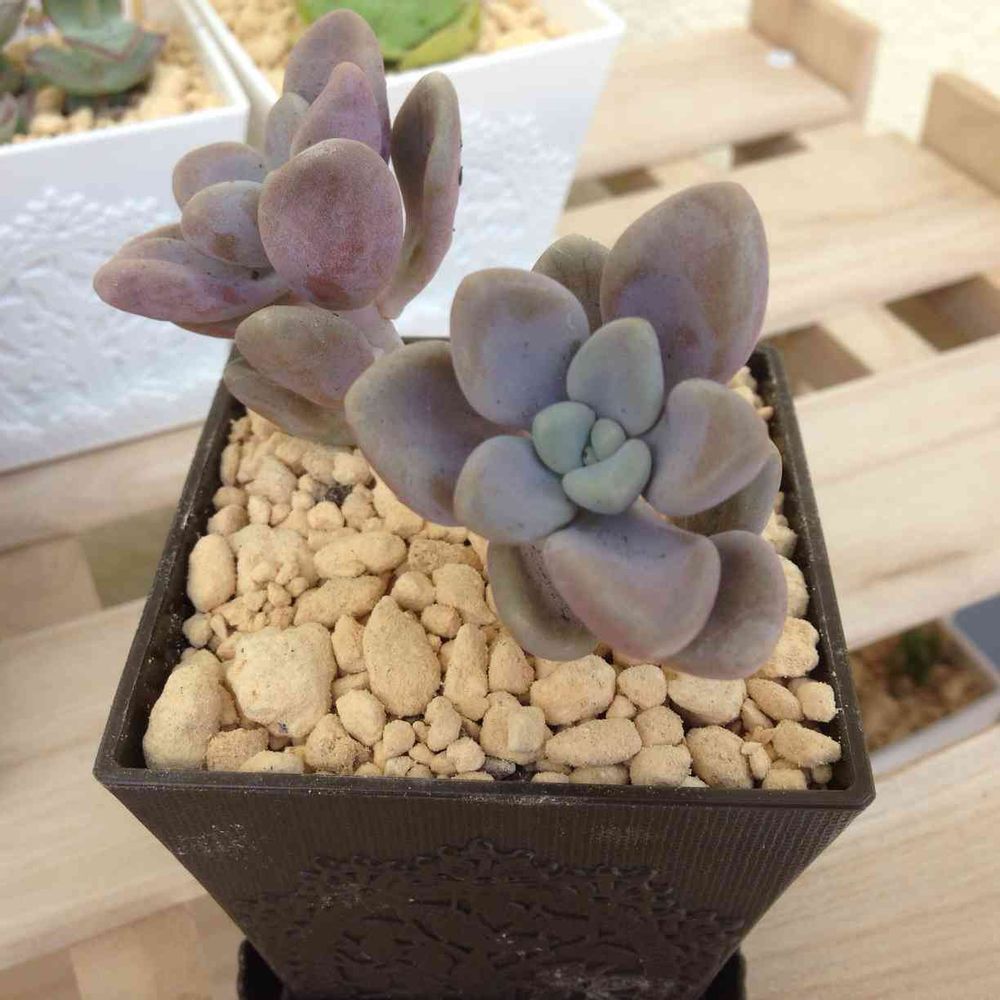 この間届いたグラプトペダルムのエレンちゃんを、昨日植え付けて自作棚に並べてました。