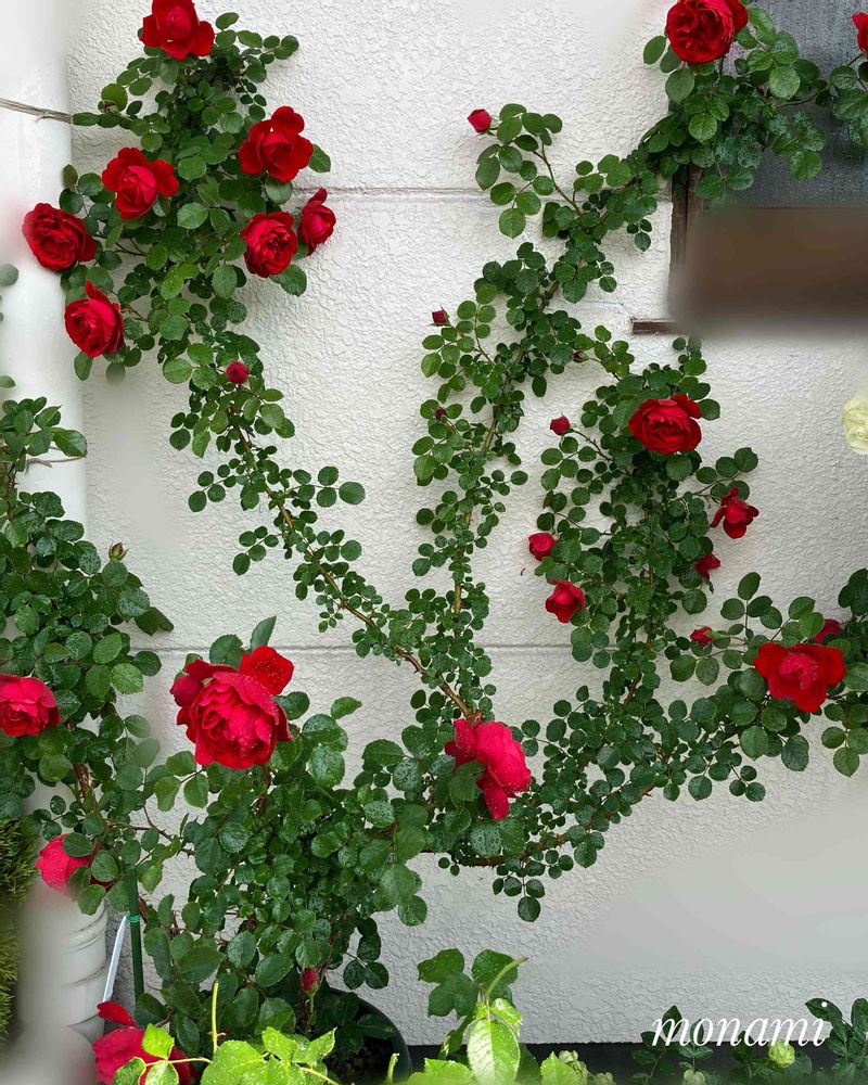 1️⃣の、白い壁に葉っぱの緑と真っ赤なバラ🌹に1票!!!キレイで丈夫なのは言うことないですね😆